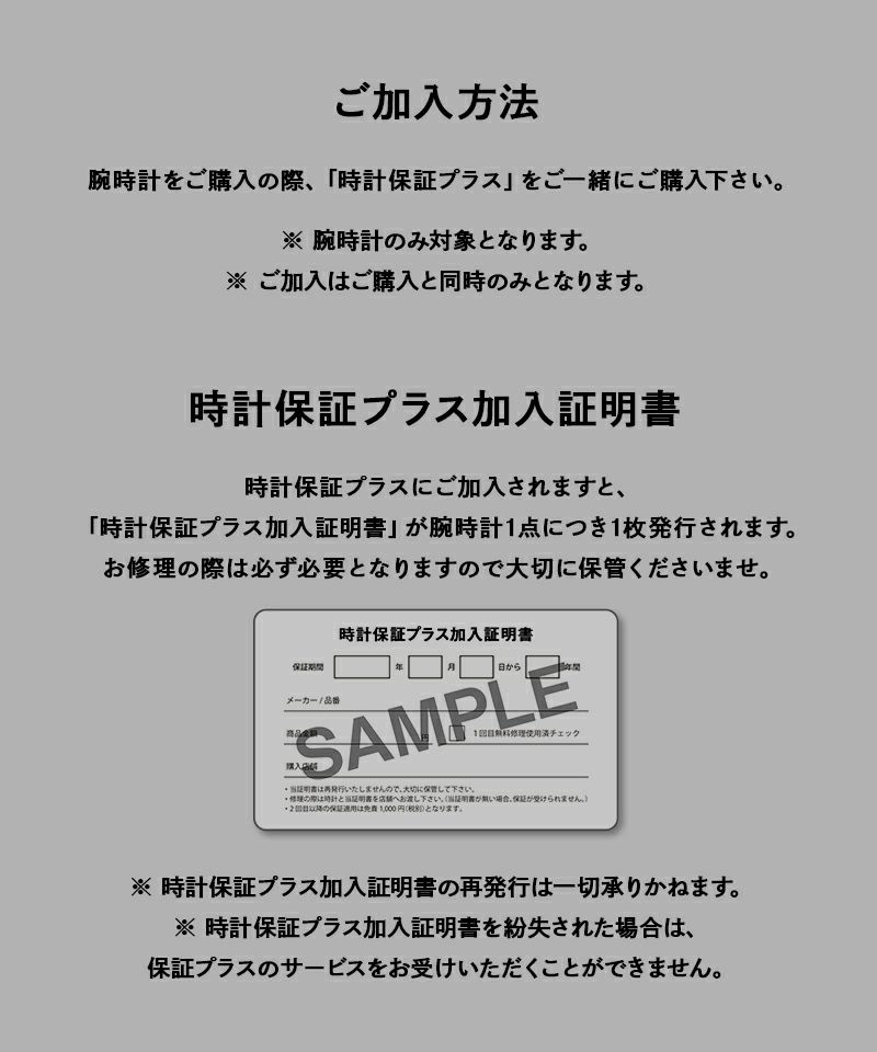 ・時計保証プラス単体でのご注文はお受けしておりません。時計保証プラスのみのご注文は、購入手続き完了後であっても受注処理時に自動的にキャンセルさせて頂きます。予めご了承ください。